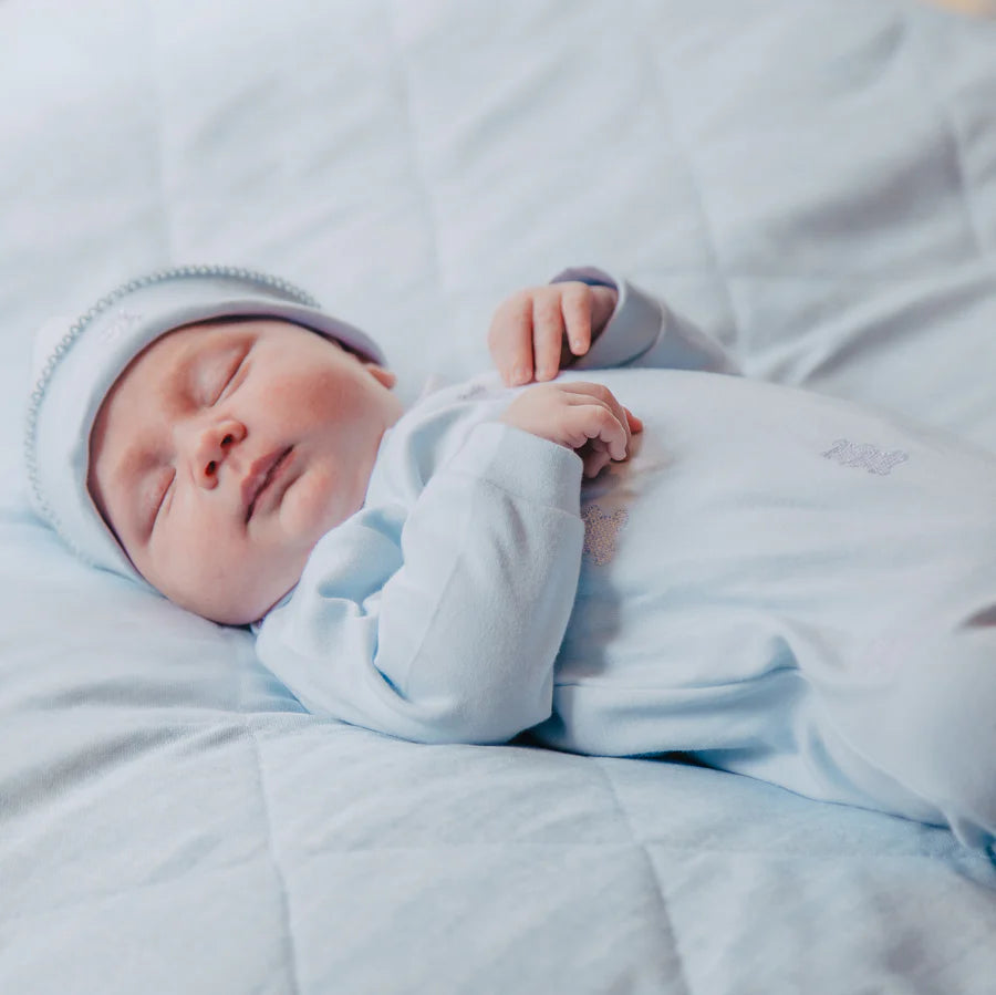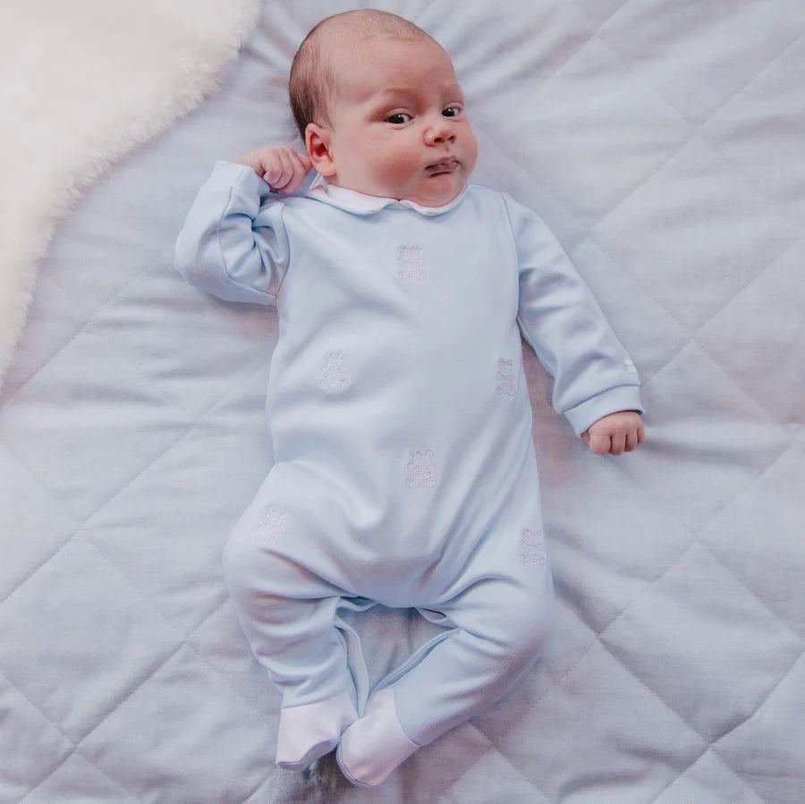 Lionel is a gorgeously cute babygrow and matching hat set. In pale blue with scattered white embroidered bears, white collar and white feet, this little outfit is a great addition to any little boys wardrobe. A cosy matching pull on hat makes it a perfect leaving hospital set.